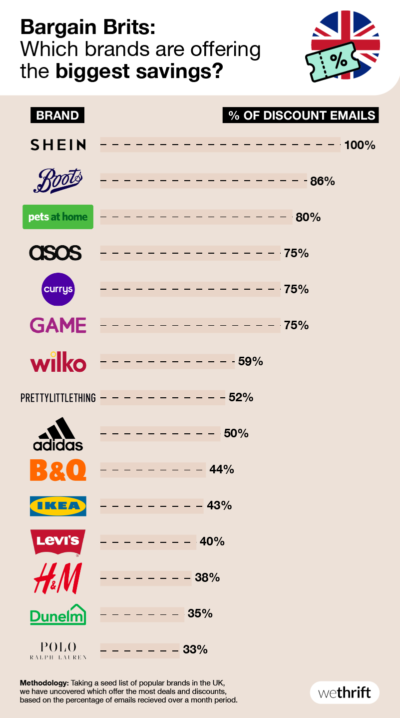 H&M (38%) and Pretty Little Thing (52%) are also hugely popular fast fashion brands and with so much stock to shift, churning out discount codes is one of the best ways to attract customers.