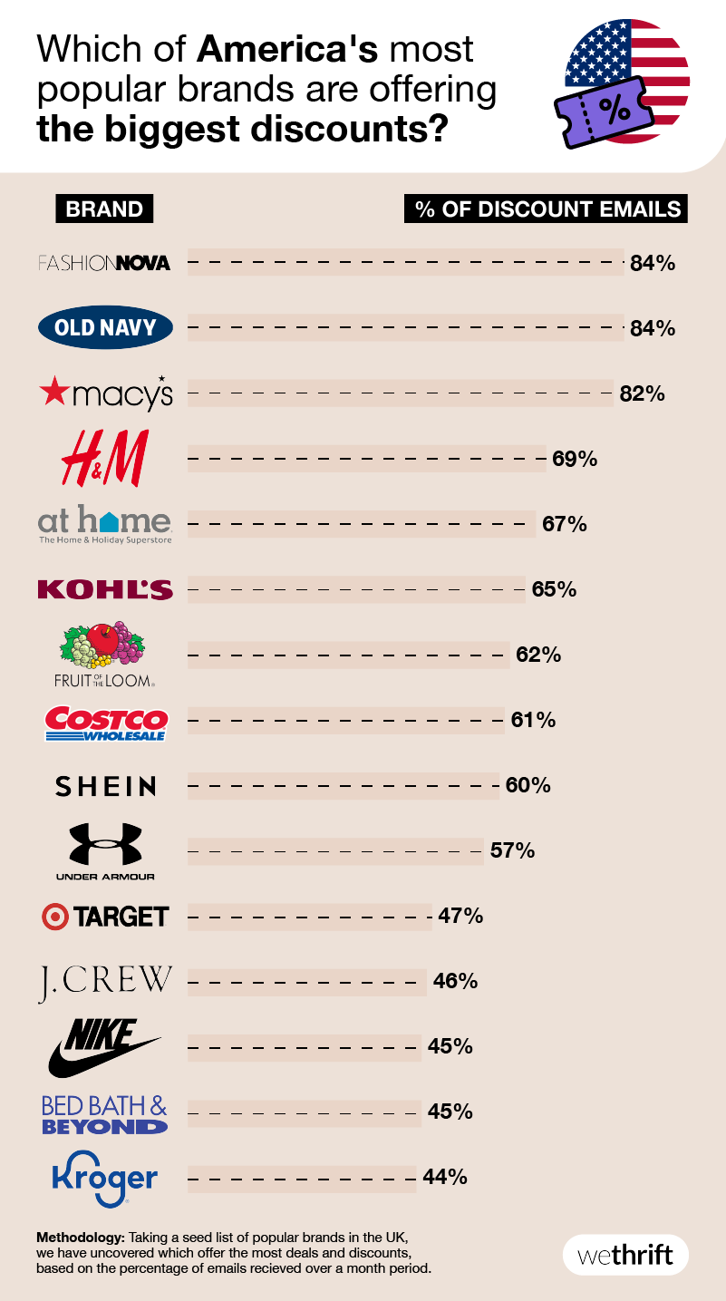 When it came to discount codes, Fashion Nova was, once again, in the top spot with 84% of their emails dedicated to them. Old Navy also received a ranking of 84%, possibly due to overhauling their stock weekly, making them very similar to fast fashion giant, Shein. Shein itself was in 9th place with a score of 60%.